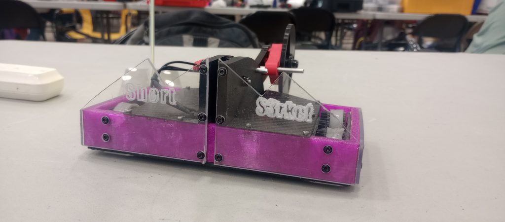 this is version one, the first of many things for us. for example it was the first with 3d printed wheels with silicone on them, first to have LEDs, and the first to be finished. This version was also the first robot we made to have carbon fiber tops. It was scapped after we were not able to add forks, or armor, leading to it’s redesign.